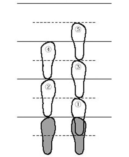 - Inspiración nasal: Es el momento de avanzar el pie correspondiente. El cuerpo se vuelve ligero, la tensión de los brazos se relaja y el centro de gravedad se desplaza hacia adelante. Se adelanta el pie justo medio paso, y cuando la raíz del dedo gordo toca el suelo, comienza la espiración.